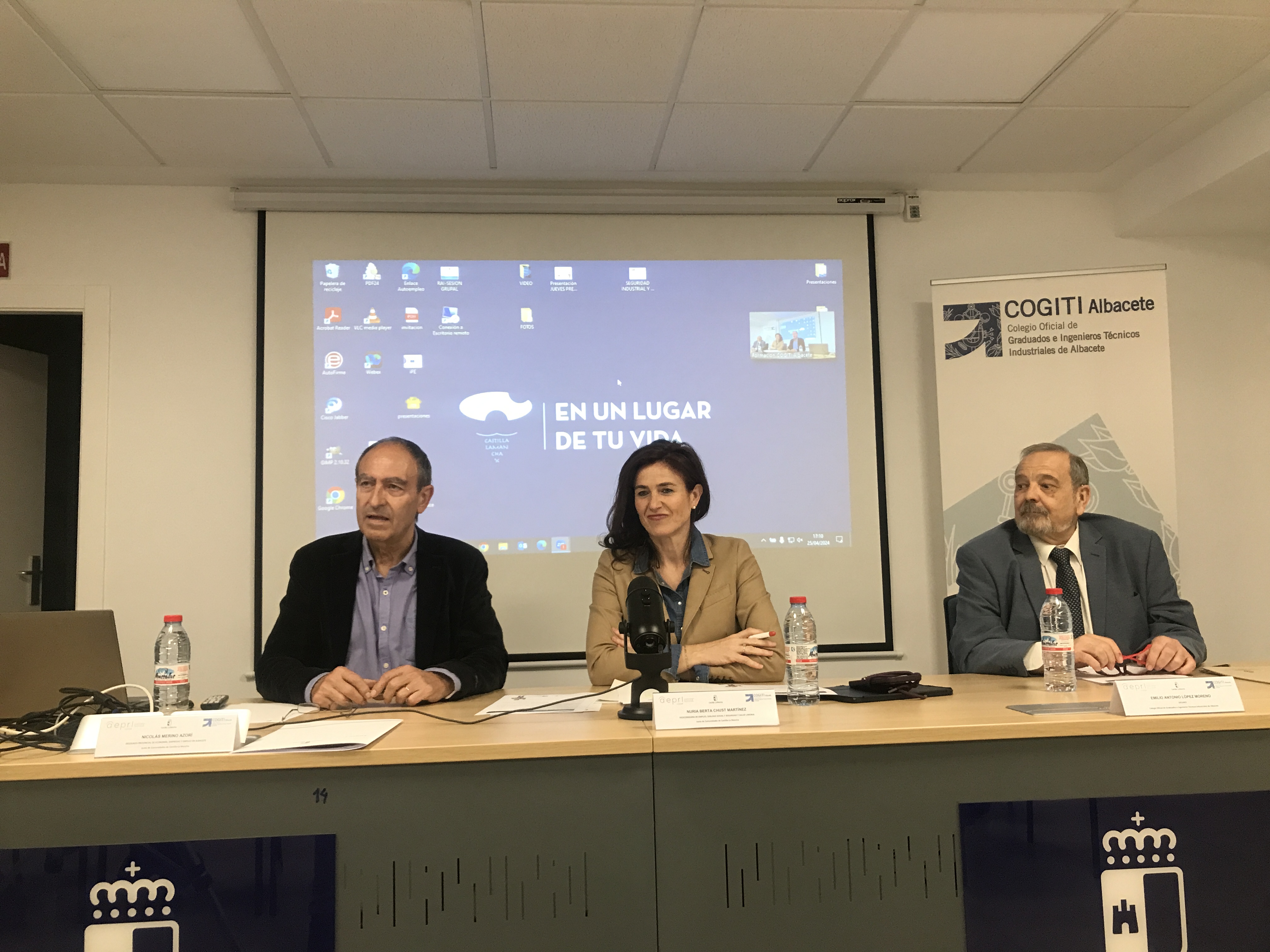 El pasado jueves 25 de abril, se reanudó la realización de LOS JUEVES PREVENCIÓN, una iniciativa conjunta de la Consejería de Economía, Empresas y Empleo y del Colegio Oficial de Graduados e Ingenieros Técnicos Industriales de Albacete, con una jornada inaugurada por Nuria Chust Martínez, Viceconsejera de Empleo, Diálogo Social y Seguridad y Salud Laboral, Nicolas Merino Azorí, Delegado de Economía, Empresas y Empleo de Albacete y Emilio Antonio López Moreno, Decano del Colegio.
