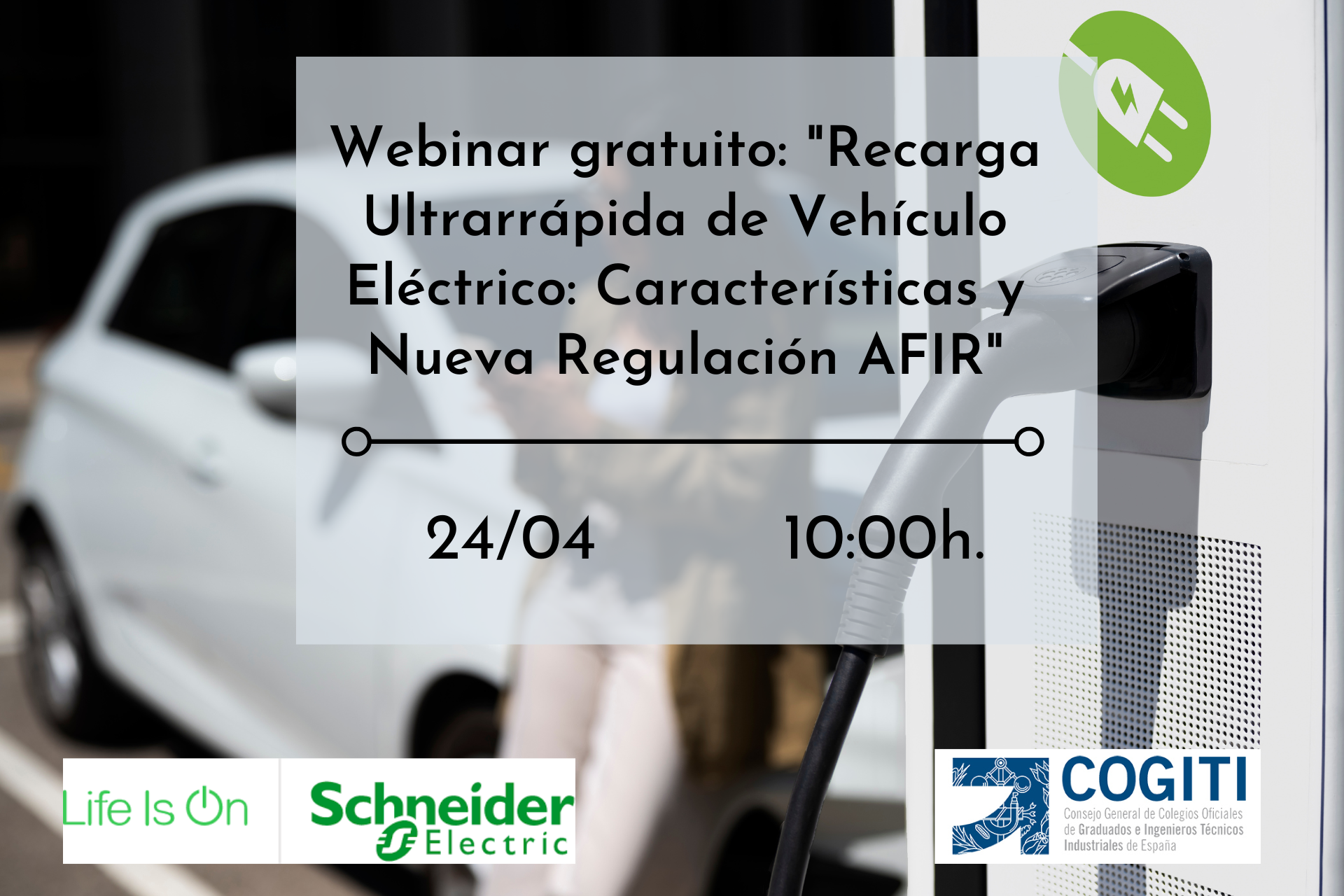 Por estos motivos, y continuando con el ciclo “Los miércoles tecnológicos” realizados por COGITI y Schneider Electric, el próximo miércoles 24 de abril de 2024 a las 10:00 a.m., tendrá lugar el Webinar Gratuito “Recarga Ultrarrápida de Vehículo Eléctrico: Características y Nueva Regulación AFIR”.