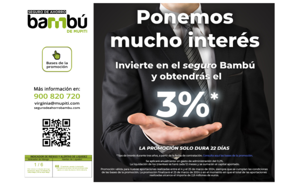 MUPITI ha lanzado la Promoción “Ponemos mucho interés”: Quienes hagan una nueva aportación al seguro Bambú, desde 10.000 euros, tendrán un tipo de interés anual del 3% durante tres años (3X3). La promoción estará activa del 4 al 25 de marzo, o hasta que el total de las aportaciones realizadas para esta promoción alcancen 2.800.000…