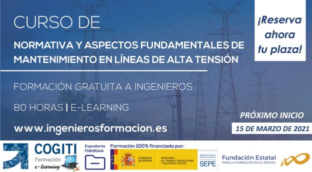 Comienzo: 15 de marzo La última edición de este curso, subvencionado por SEPE-FUNDAE, será impartida por teleformación a través de la plataforma www.ingenierosformacion.es Con una duración prevista de 80 horas, este curso tiene como objetivo Adquirir conocimientos y habilidades en la aplicación de las técnicas necesarias para el mantenimiento de líneas aéreas de alta tensión,…