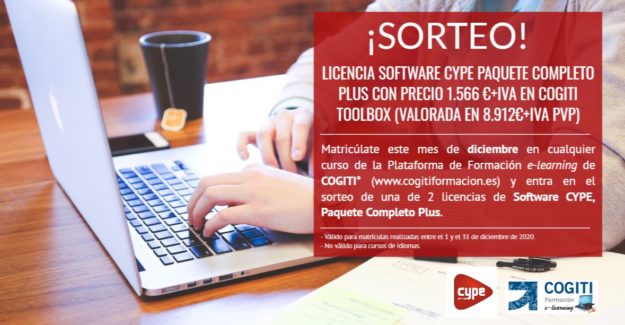 Leer másSi te matriculas del 1 al 31 de diciembre de 2020 en alguno de los cursos de la Plataforma de formación online www.cogitiformacion.es podrás conseguir una de las dos licencias de Software CYPE – Paquete Completo Plus valorada en 1.566€+IVA en el portal COGITI TOOLBOX (www.toolbox.cogiti.es) (8.912€ + IVA PVP) El SORTEO se realizará el próximo…