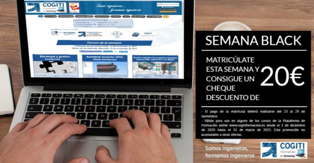 ¡Aprovecha la semana Black Friday de la Plataforma de Formación del COGITI! Apuesta por tu formación y matricúlate del 23 al 29 de noviembre* en alguno de los cursos de la Plataforma de formación online www.cogitiformacion.es y recibe un cheque descuento de 20 euros**.   Condiciones: *    El pago de la matrícula deberá realizarse en el…