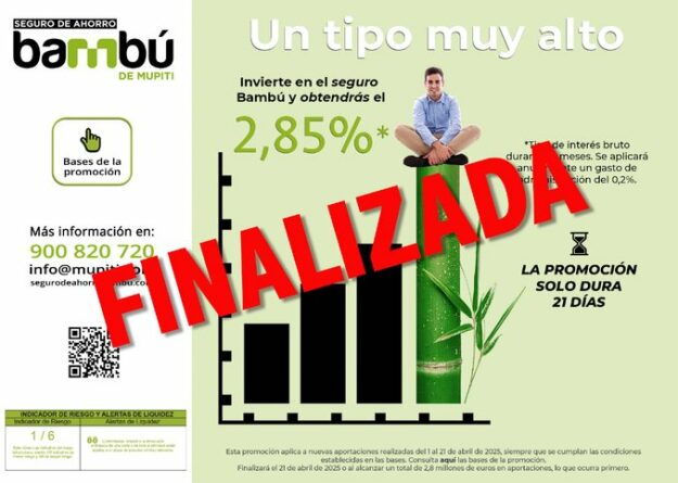 04/04/2025 – ACTUALIZACIÓN: Informamos de que ya se ha alcanzado la cifra límite de aportaciones para esta promoción (2,8 millones de euros), por lo que se da por finalizada. Desde MUPITI nos informan del lanzamiento de una promoción excepcional que ofrece una rentabilidad altamente competitiva para nuevas aportaciones al seguro de ahorro Bambú. Te informo…