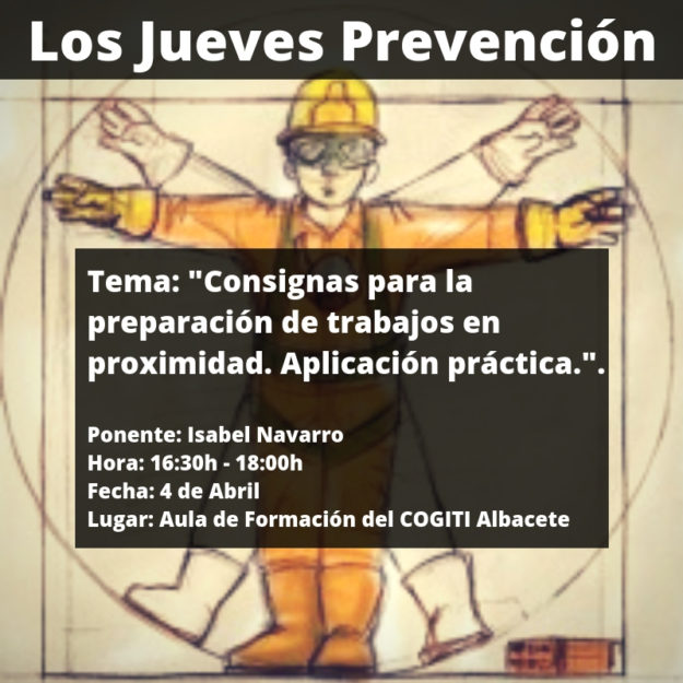 Consignas para la preparación de trabajos en proximidad. Aplicación práctica. El próximo 4 de abril, el COGITI Albacete celebrará una nueva sesión de los Jueves Prevención. En esta ocasión será Isabel Navarro, Grado Superior en PRL con 11 años de experiencia como técnico de Prevención, y desde 8 años en el servicio de prevención ajeno…